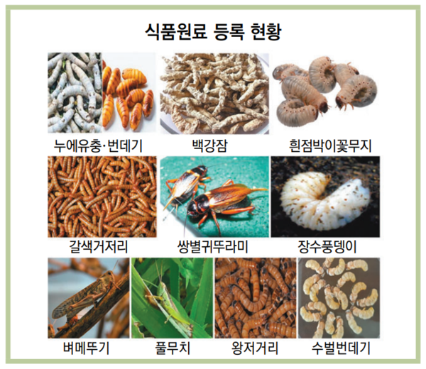 이 밖에, 귀뚜라미 와 장수풍뎅이 유충도, 한시적인 식품 원료로 인정되었습니다.